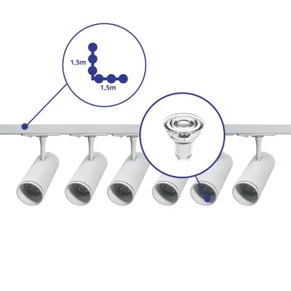 | Fabrikantnaam | Complete L shaped 1-Phase Track Set White incl. 6x Spot fixture + GU10 2700K 3W Dim – 1.5 x 1.5 mete | |