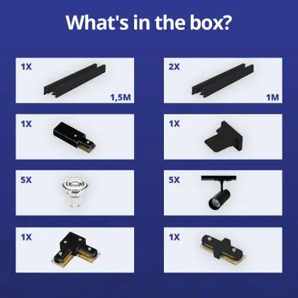 | Fabrikantnaam | Complete L shaped 1-Phase Track Set Black incl. 5x Spot fixture + GU10 2700K 3W Dim – 1,5 x 2 meter | |