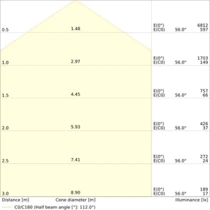 De lichtopbrengst (Lumen), geeft weer hoe krachtig het uitgestraalde licht is. Dit is belangrijk om te weten om de juiste sfeer te creëren. 0 tot 400 Lumen is bij uitstek geschikt voor accent- of sfeerverlichting. Een hoger aantal Lumen is, afhankelijk van de grootte van de ruimte, beter geschikt als ondersteunende- of basisverlichting. Heb je plafonds hoger dan 4 meter, dan is een lichtopbrengst van minimaal 8000lm aan te raden indien heldere verliching gewenst is (vb. in werkomgevingen).