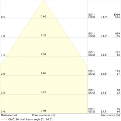 De gradenbundel geeft informatie over hoe breed het licht wordt uitgestraald. Dit zit tussen de 0 en 360 graden (D). Hoe kleiner de hoek, hoe specifieker de lichtbundel is. Over het algemeen is een smalle gradenbundel perfect voor sfeer- of accentverlichting, terwijl een brede gradenbundel ideaal is om grote oppervlaktes te verlichten.